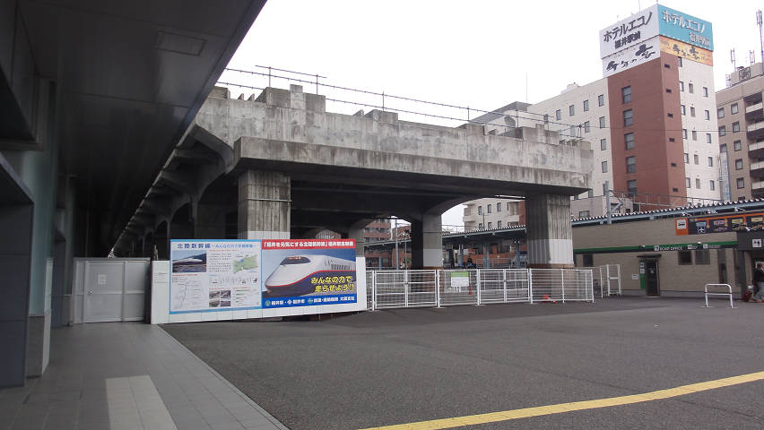 사진에서는 이해하기 어렵다고 생각합니다만, 선행해 만들어진 신간선의 고가의 근처에, 고속버스의 대합실의 건물의 안쪽에 있는 프리패브 오두막의 역사가, 상철도의 후쿠이역이 됩니다.