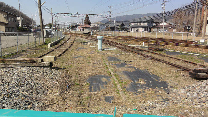 写真右の途切れた線路がかっての永平寺線の名残と思われます。