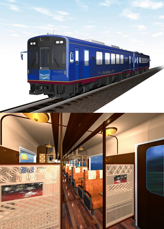 새롭게 도입하는 2량의 디자인 컨셉은「노토의 사토야마리해가 구성하는 풍경과 순의 맛을 즐기는, 온기와 그리움을 느끼게 하는 관광 열차 」.디자인은 공업 디자인 회사「코보」의 야마무라 신이치 대표가 감수 했다.