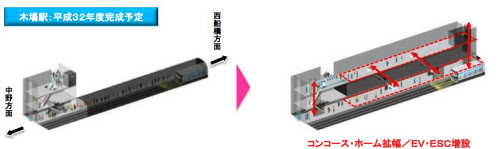 거기서, 서쪽 출구측의 약 70 m로 기존의 쉴드 터널을 해체해, 양홈간을 멀리하고 있는 부분을 철거해 홈을 확폭.터널상에 새로운 콘 코스를 마련해 에스컬레이터와 엘리베이터를 늘려, 이용자의 흐름을 분산시켜 혼잡 완화를 도모하게 되었다.열차를 운행하면서 기설의 쉴드 터널 (을)를 해체해, 지상으로부터 굴착해 새로운 공간을 낳는 공사는 세계 최초의 사례다.