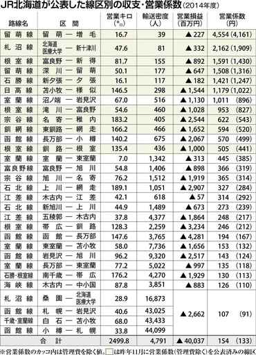JR北海道は29日、道内の全14路線30区間について、100円の営業収益を得るのに必要な費用を示す「営業係数」の2014年度分を公表した。直接的な運行費用だけでなく、本社・支社の管理部門の費用を加えると、人口が集中する札幌圏を含めて全区間が赤字だった。JRは「都心でも鉄道経営は厳しい