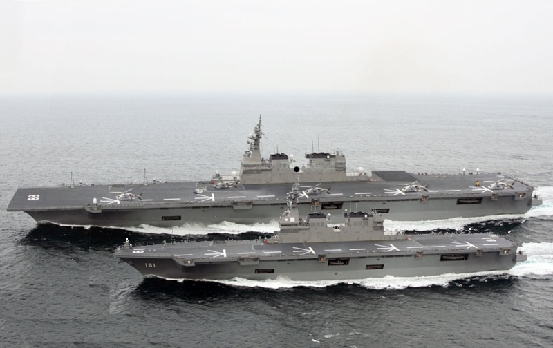 해상 자위대는 항모와 유사한 13,500톤급 호위함과 (휴우가급 헬기 탑재 호위함) 19,500톤급 호위함 (이즈모급...)에