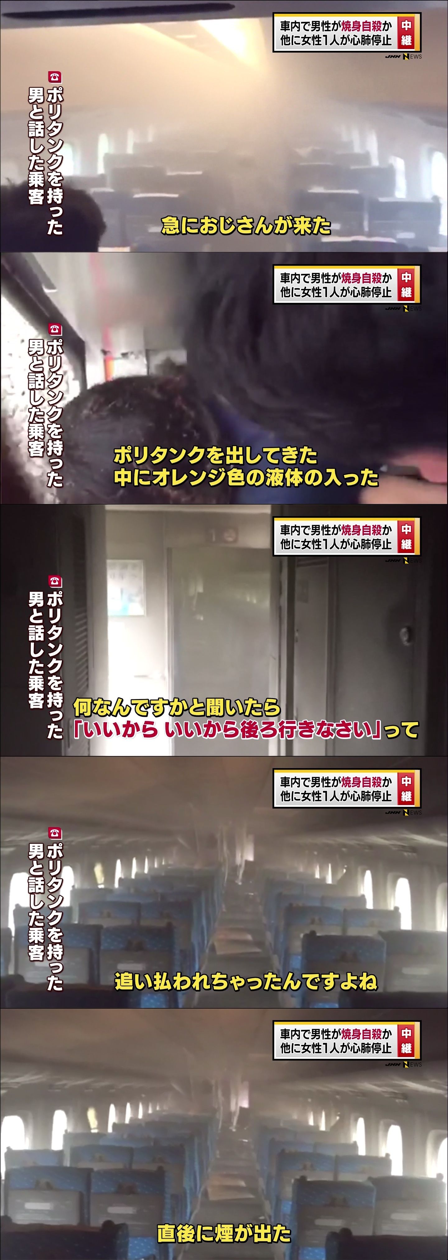 JR東海(Central Japan Railway)の広報担当者はAFPに対し、客室の中で乗客が油のようなものをかぶって火をつけたという情報が入っていると語った。