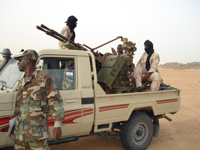 도요타 랜드크루져 픽업 트럭에 타고 있는 니제르군인.픽업 트럭에 타고 있는 니제르군인 들고 있는 대전차 로켓포는 RPG-7 대전차 로켓포.