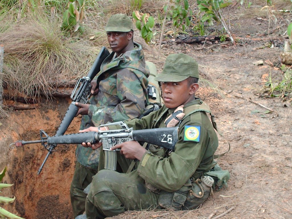 M-16A1突撃小銃と M249ミニミ機関銃を持っているベリーズ軍人たち