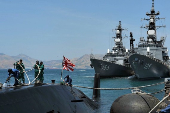 フィリピンに寄港した海上自衛隊の潜水艦「おやしお」(左)、護衛艦「ありあけ」と「せとぎり」
