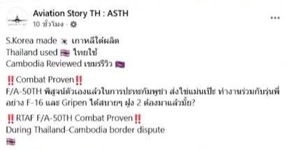 태국 왕립공군 : 한국에서 개발된 T-50TH 전투기가 형제 기종인 F-16, 그리고  그리펜과 함께 캄보디아의 군사 목표물을 성공적으로 공습했습니다.