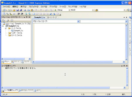 これでプロジェクト「Sample1_1」が完成や。あとは実際にプログラムを打ち込むソースファイルを作成するで。
