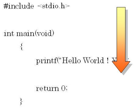 では、さっきのプログラムがどうやって動いてるのか見てみようか。まずC言語の基本としてプログラムが上から下に実行されるようになってる。