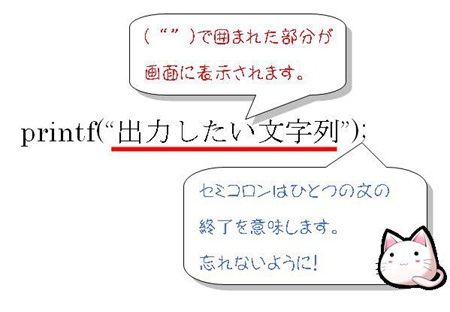 次はprintfについてや。じつはこれ、さっきのstdio.hによって使えるようになったもんなんや。これを使うことでC言語はディスプレイに出力したい文字列を表示することができるんやな。