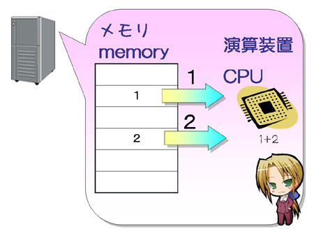 次にそのとりあえず記憶した場所から取り出し、コンピュータの演算装置(CPU)で計算します。
