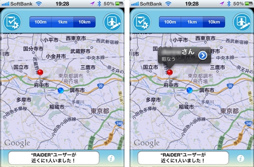 ログインすると現在位置を中心に、半径1kmのエリア内のアプリユーザーが検索されます。検索範囲は、100m、1km、10kmの3段階。