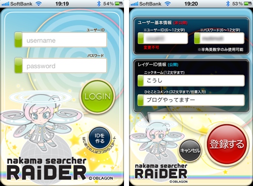 사용법은 간단, 인스톨 하면 최초로 유저 ID, 패스워드, 닉네임, 코멘트를 입력해, 회원 등록을 해 둡시다.모두 익명의 정보로, 개인을 특정할 수 있는 정보는 일절 필요 없습니다.