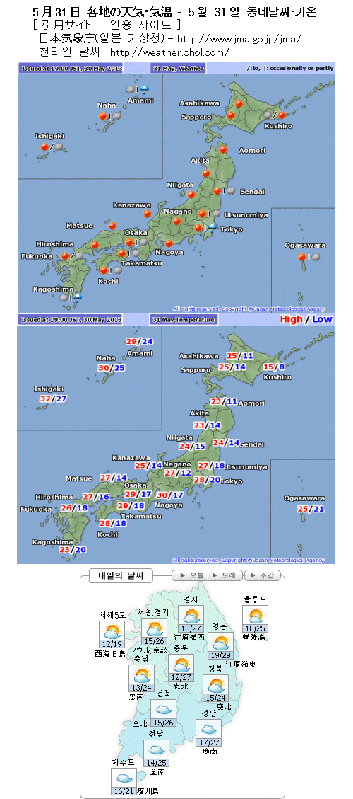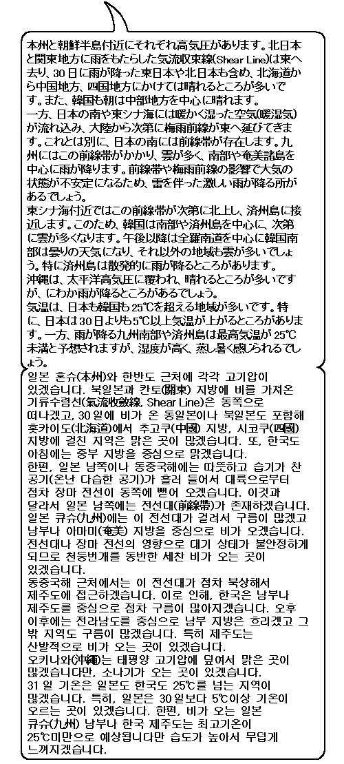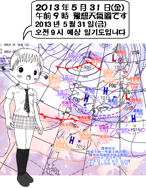 일기도에 보이는 장마전선은 아직 짧아서 일본이나 한국에 직접적인 영향을 주지 않는 것으로 보입니다만 그 북쪽에 있는 잠재적인 전선대(前線帶)의 영향으로 일본 큐슈(九州) 남부에 비가 오겠습니다. 또 한국도 제주도는 비가 오는 곳이 있겠고 그 밖 지역도 남부일수록 구름이 많겠습니다.