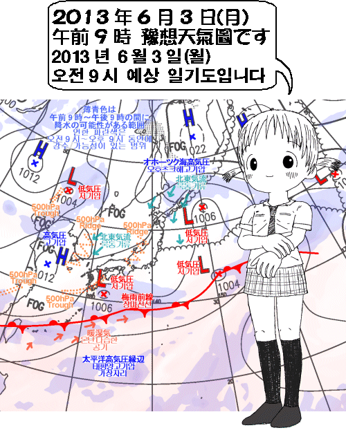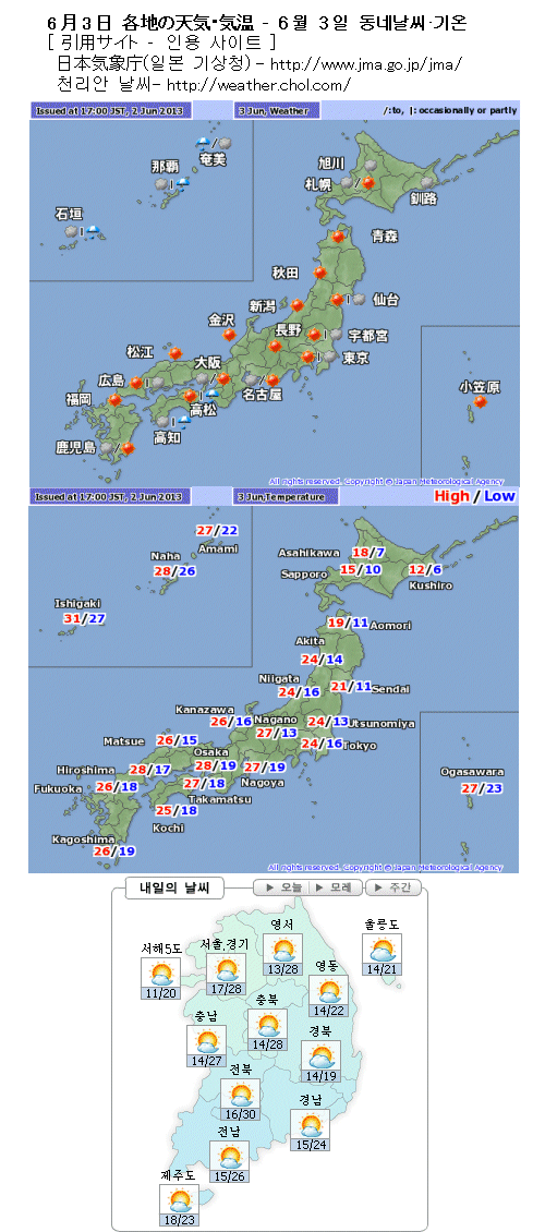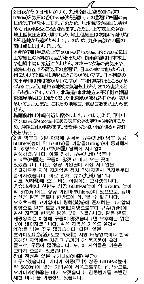 장마전선은 남하해서 일본 본토도 한국도 맑은 곳이 많겠습니다. 한편 일본 오키나와(沖繩)는 장마전선의 영향으로 비가 오겠고 천둥번개를 동반하거나 세찬 비가 오는 곳이 있겠습니다.