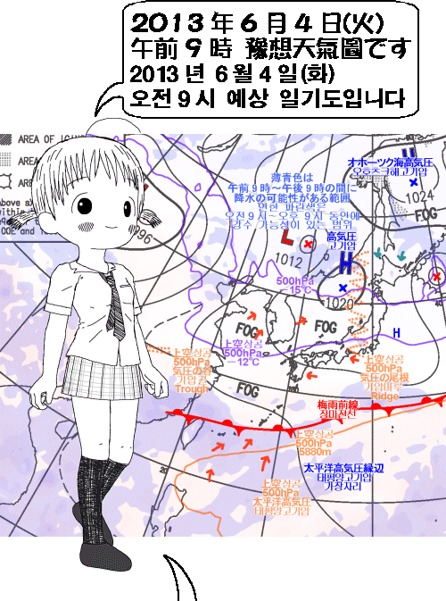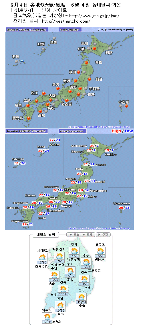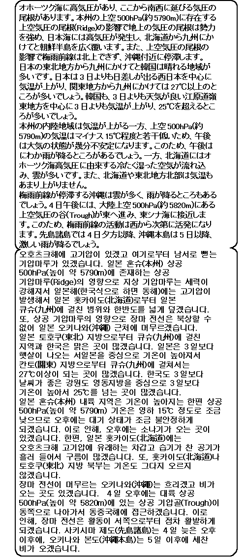 일본 오키나와(沖繩)는 정마전선의 영향으로 흐리거나 비. 또 일본 홋카이도(北海道)나 그 주변 지역은 오호츠크해 고기압으로부터 흘러 드는 차갑고 습기가 찬 기류의 영향으로 구름이 많겠고 기온도 높아지지 않겠습니다. 그 밖 지역은 일본도 한국도 건조하고 맑은 곳이 많겠고 기온도 꽤 높아지겠습니다.