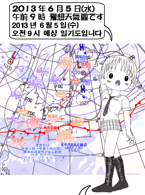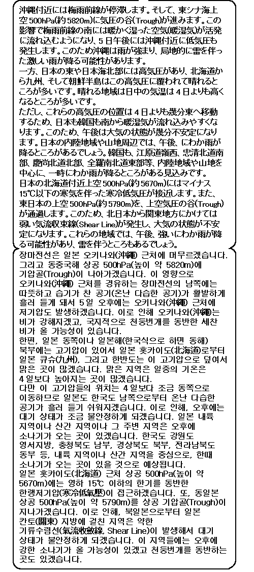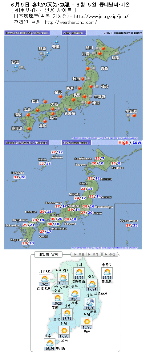 오키나와(沖繩)는 장마전선 활동이 활발하게 돼서 천둥번개를 동반한 세찬 비가 오겠어요. 그 밖 지역은 오늘에 비슷해서 맑은 곳이 많겠어요. 다만 오늘보다 대기 상태가 불안정해서 소나기가 오는 곳이 많아질 것 같아요.