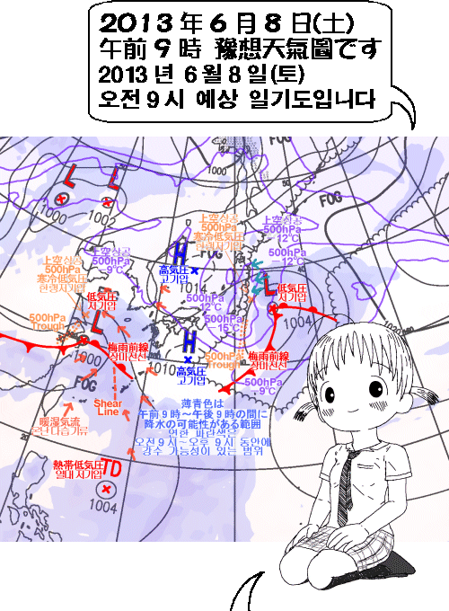 오키나와(沖繩)나 제주도는 비가 오겠고, 특히 오키나와(沖繩)는 세찬 비가 올 염려가 있어요. 그 밖 지역은 맑은 곳이 많겠어요. 기온이 높은 곳이 많아서 덥게 느껴지겠어요. 또, 기온이 그다지 높지 않은 지역도 습도가 높겠어요. 열사병에 조심하시기 바랍니다.