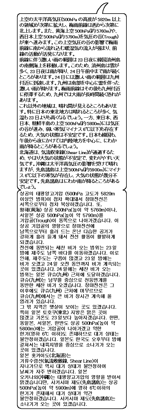 중단중였던 비 계절이 부활. 일본 큐슈(九州)는 남부를 중심으로 세찬 비가 오겠습니다. 그 밖 지역도 대기 상태가 불안정해서 구름이 많겠고 오후에는 소나기가 오는 곳이 있겠습니다.