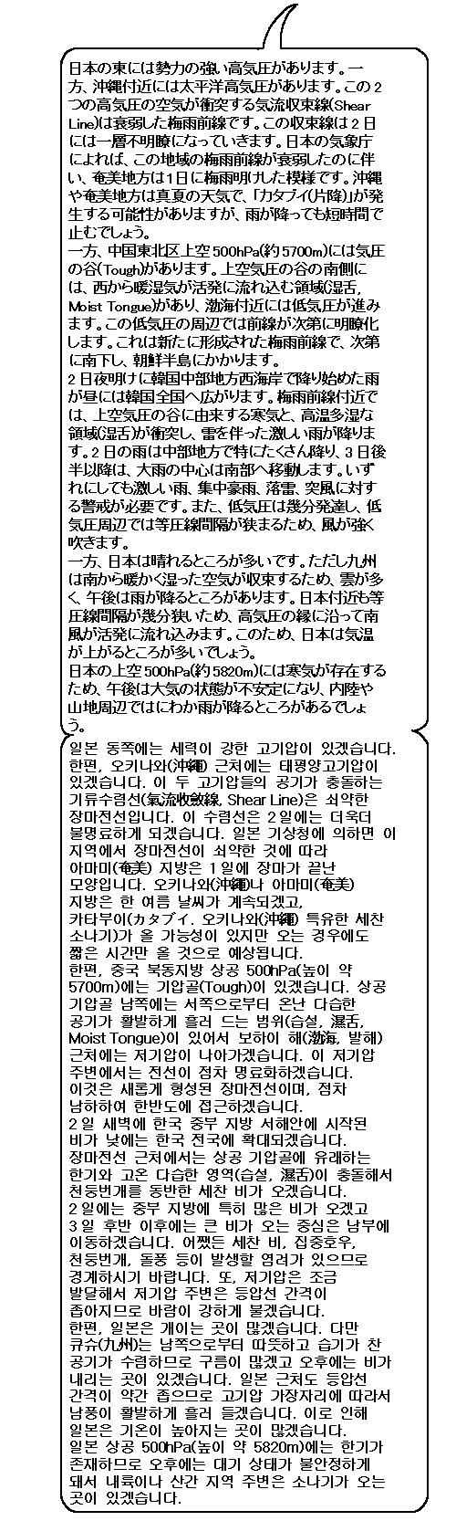 일본 근처에서는 장마전선이 쇠약해지겠고 햇살이 나와서 기온이 높아지는 곳이 많겠습니다. 한편 한반도 북서에서 장마전선이 부활하겠고 한국에 접근하겠습니다. 한국은 내일 이후에 전국적으로 큰비가 올 염려가 있습니다.