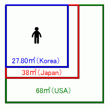 주간「에코노미스트」에 의하면1990년대 중순,도쿄, 수도권에 공급된 맨션의 평균 점유 면적은64.5평방 미터 정도, 거기에 비교 한국은 서울이 평균105.8평방 미터, 용인지역은132.2평방 미터에 이르고 있다.일본인의 대부분이(한국인이 평균적으로 거주하고 있다)105.8평방 미터만한 맨션에서 살고 있으면 가정하면,171.9평방 미터에서211.6평방 미터만한 넓은 집에서 살고 있는 것이 한국인이라고 하는 것이다.(중략) 세계 최고의 복지국가라고 해도,토끼울로 일생을 사는 것이 일본인의 숙명.