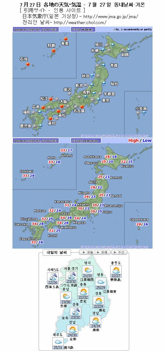 일본은 한랭저기압(寒冷低氣壓)이나 이것에 동반되는 강한 한기의 영향으로 북일본으로부터 동일본을 중심으로 대기 상태가 불안정햐여 천둥번개를 동반한 새찬 비가 오는 곳이 많겠습니다. 한편, 한국은 서쪽에서 장마전선이 북상하겠습니다. 오후 이후에 서쪽 지역을 중심으로 비가 오겠습니다.