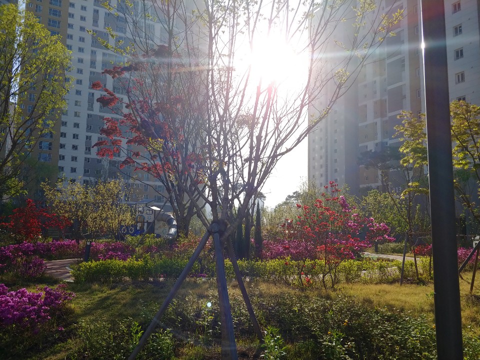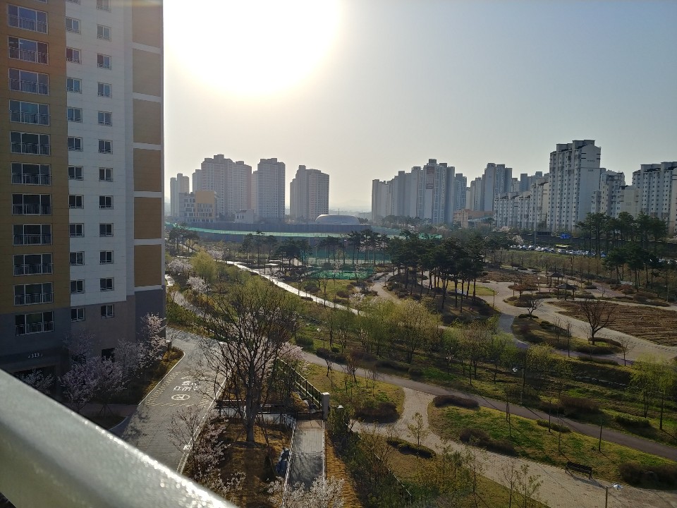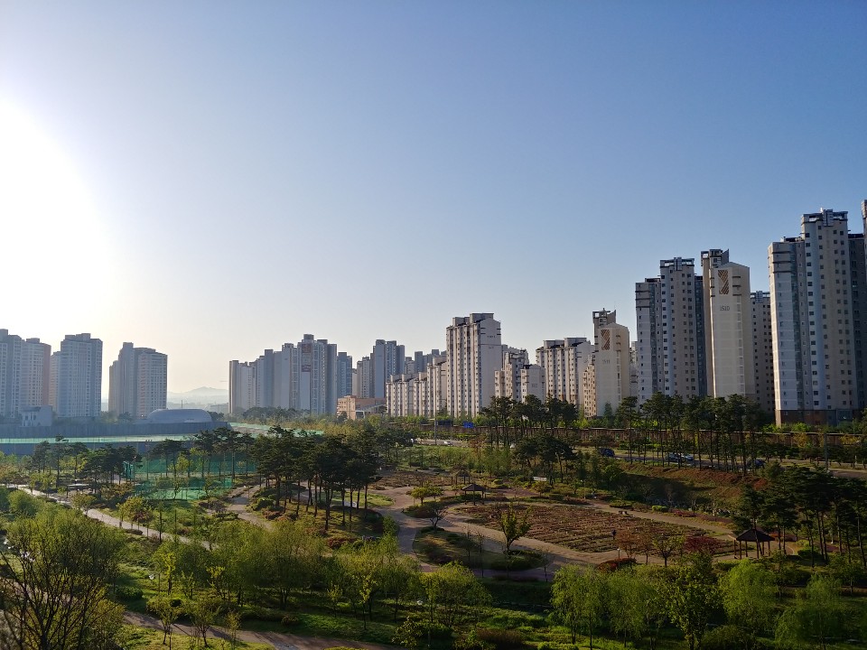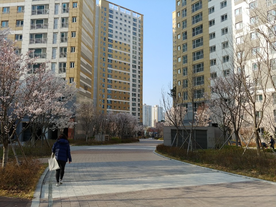 제가살고있는 아파트 단지 내부 입니다. 아파트 건물사이에 일조권을 위해 간격이 있으며 이곳에 주민 공동시설, 정원, 놀이터가 있습니다. 2000년도 이전에는 옥외 주차장들이 많이 있었지만 2005년도 쯤 부터 대도시지역의 아파트들은 대부분의 주차장이 지하에 있습니다.