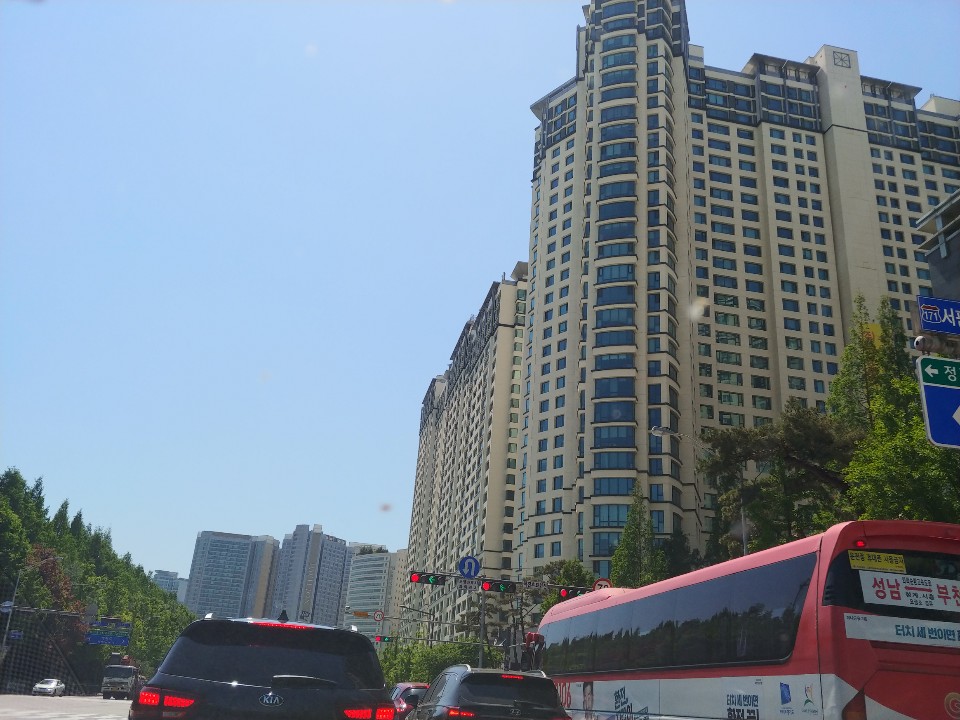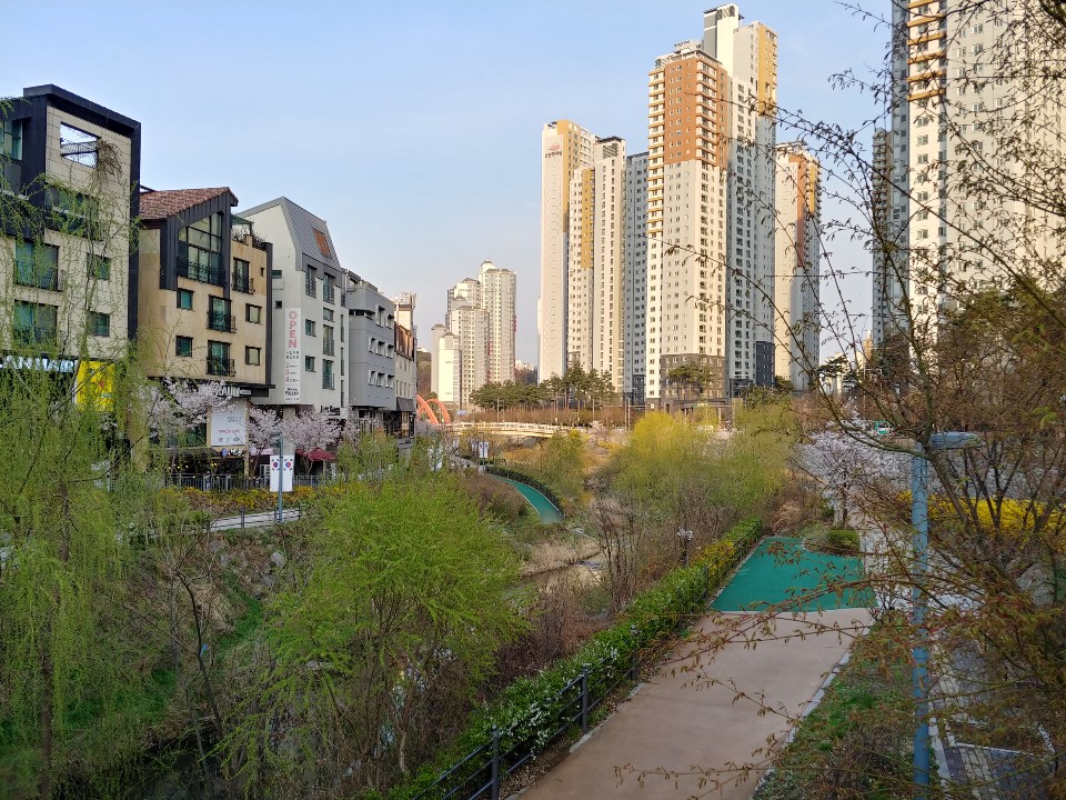 서울 근처 도시의 고급 주택 지역 입니다. 우측에 있는 아파트는 주상복합건물이며 이런 주상복합 건물은 1~3층에 상점이 있습니다. (소형병원, 사무실, 편의점, 식당, 학원, 약국이 주로 있으며 규모에 따라 카페, 대형마트도 입점합니다.)