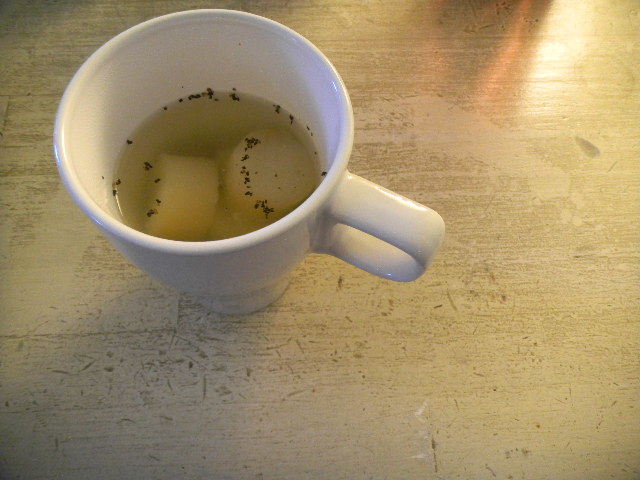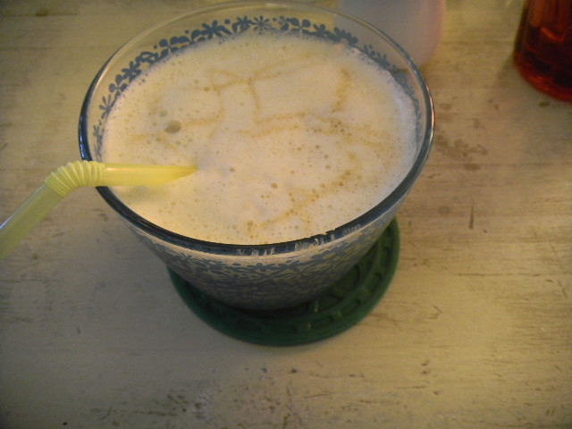 この時、彼女が、このカフェ(cafe)で飲んだ、飲み物の一つ。冷たい、きな粉(kinako。大豆を粉末にした食品)ラテ(latte)。この他、彼女は、この時、この店では、コーヒー(coffee)を飲みました。