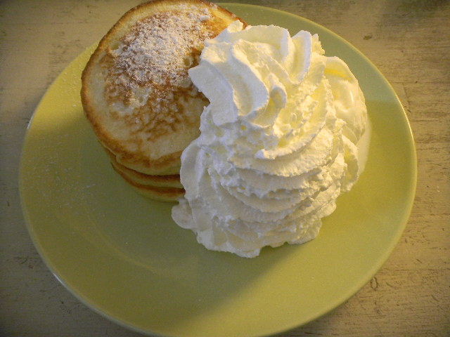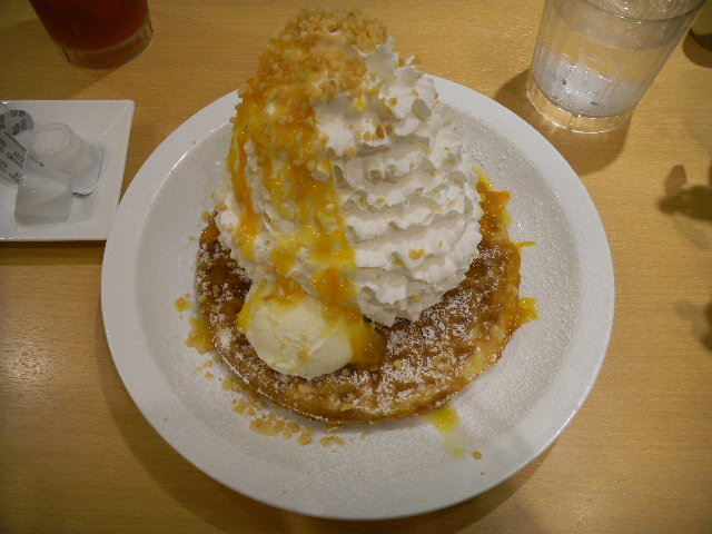 cream)が載らない、パンケーキ(pancake)とワッフル(waffle)を注文する事も、出来ます)。前回、この店を利用した時(初めて、この店を利用した時)は、パンケーキ(pancake)を食べたのですが、(この店は、ワッフル(waffle)よりも、パンケーキ(pancake)を売り(自慢のメニュー(menu))としている様ですが)、個人的に、この店は、パンケーキ(pancake)よりも、ワッフル(waffle)の方が、良いと思いました。ワッフル(waffle)自体の、味は、極々普通なのですが(ちなみに、この店の、パンケーキ(pancake)自体の味は、食べた時、並みと言った印象でした)、この店の、たっぷりな(多い)、ホイップクリーム(whipped