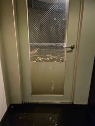 ドアの下の隙間から浸水し、廊下は水浸しに