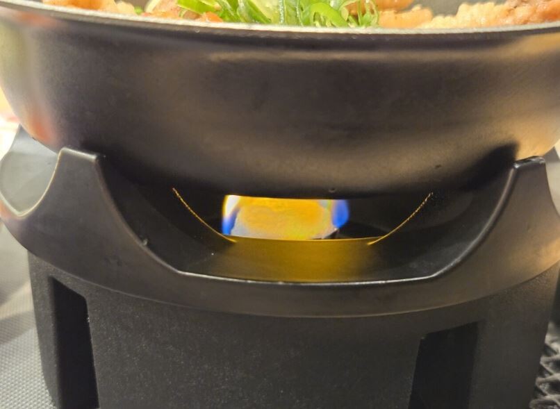 三枚肉はあらかじめ焼かれた状態で提供されるが、プレートの下には固形燃料がセットされており、約20分間は温かい状態で楽しめる。