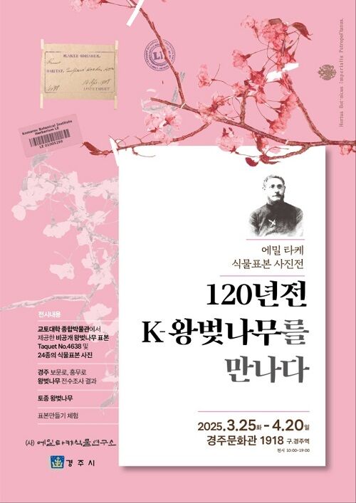 「エミール・タケ植物研究所」(理事長:チョン・ホンギュ)が、エミール・タケ植物標本写真展「120年前、K-王桜と出会う」を、3月25日から4月20日まで慶州文化館1918(旧・慶州駅)で開催中だ。