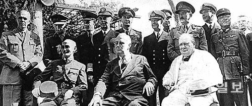 幾多の弱小植民地の中で特に韓国の独立のみを明示上に約束したカイロ宣言は我が民族の ‘独立の門’ であった. 前列左側からカイロ会談に参加した 3個連合国の首脳である張介石中国総統, フランクリンルーズベルトアメリカ大統領, ウィンストンチャーチルイギリス総理. 東亜日報DB