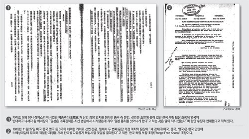一時与えた檀国大教授(史学)はこれを駁する中国側史料を掘り出した. 中華民国(台湾) 国民党当社(党史)委員会が 1981年発行した ‘中華民国重要史料初編(初編): 対日抗戦時期’だ. 第2次世界大戦当時中国の展示外交記録を集めたこの史料にはカイロ会談中国側議題下書きと張介石の秘書長ワングツングフイ(王寵恵)が残した会談日誌が載せられている.