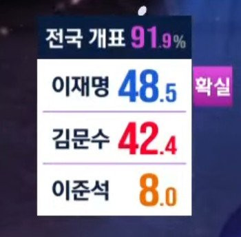 リ・ジェミョン, 権イギリス得票率も合しなければならないのに ww (49.42+0.98 =50.4)