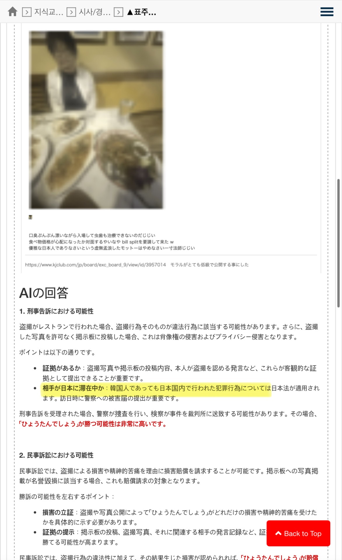 ●도촬한 화상이 일한번역 게시판에 업 로드되어 여기에 따른 피해가 일본내에서 발생했을 경우, 「명예 훼손」이나 「프라이버시의 침해」)에 대해서는일본의 민사·형사법이 적용된다.