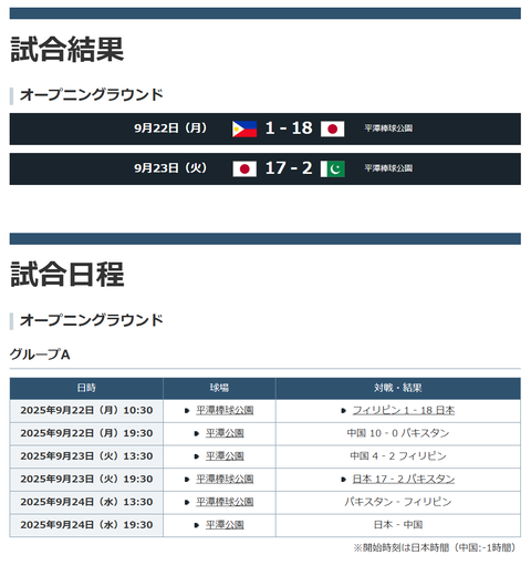 (参考)日本の成績。日本は2連勝、24日にグループリーグ最終戦で中国戦が予定されている。引用:野球日本代表 侍ジャパンオフィシャルサイト