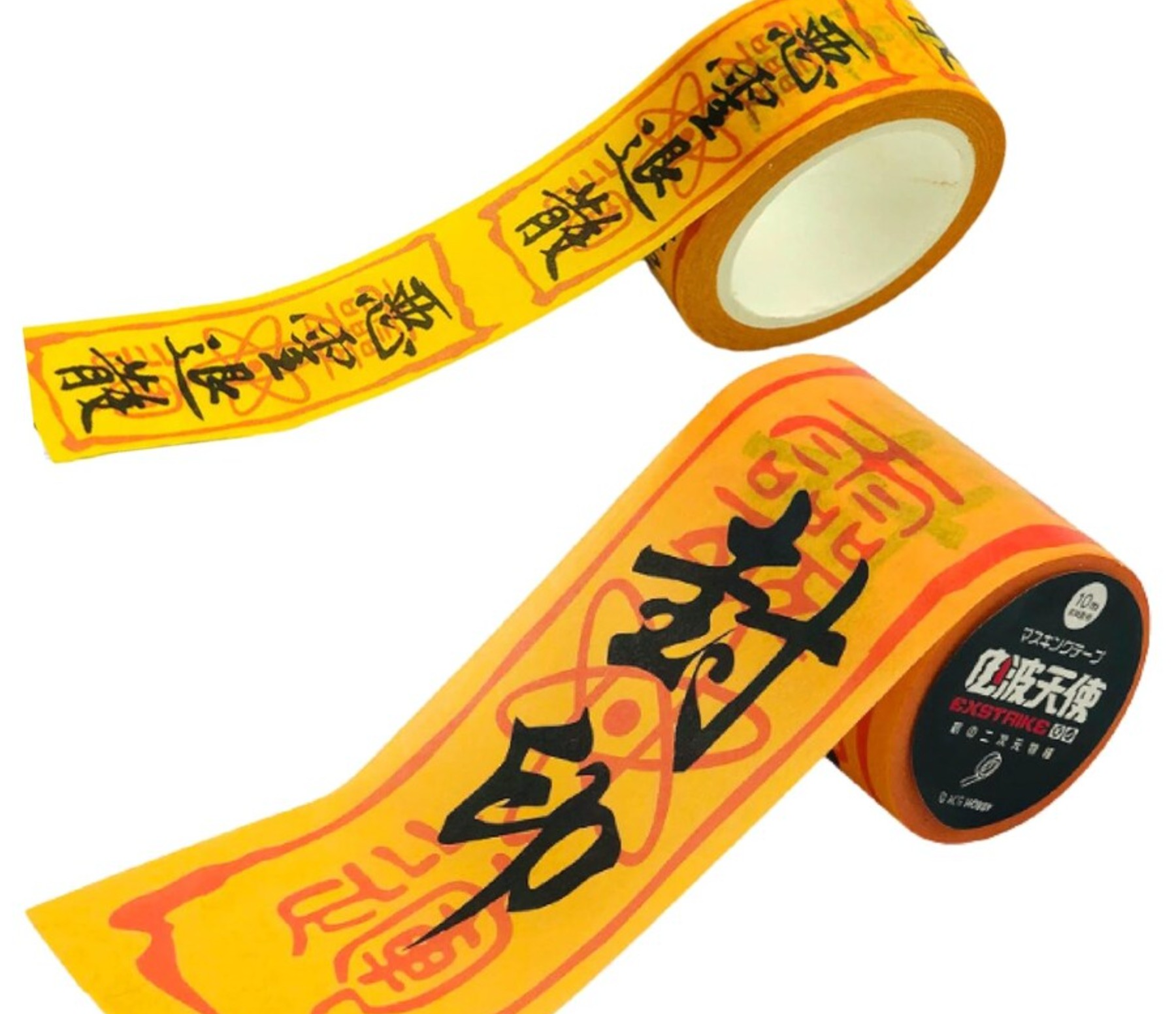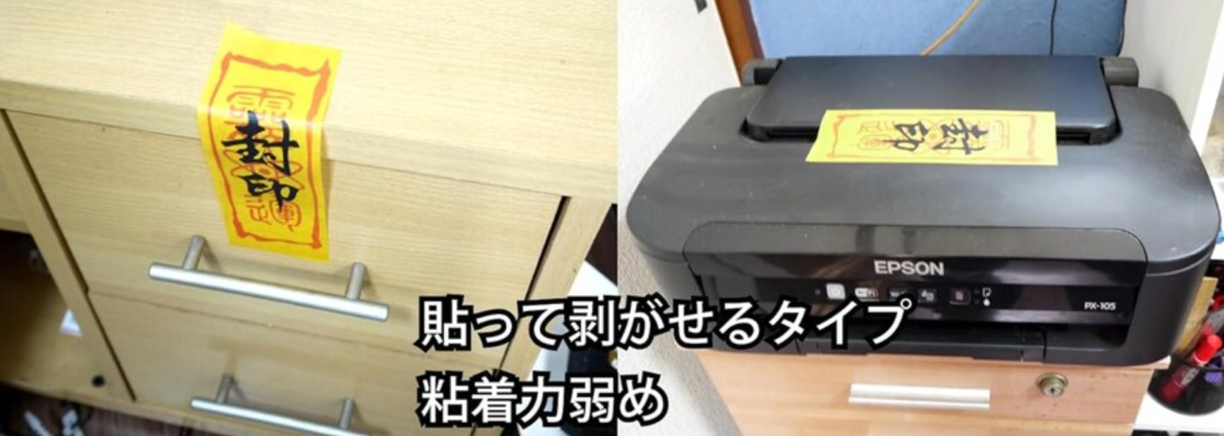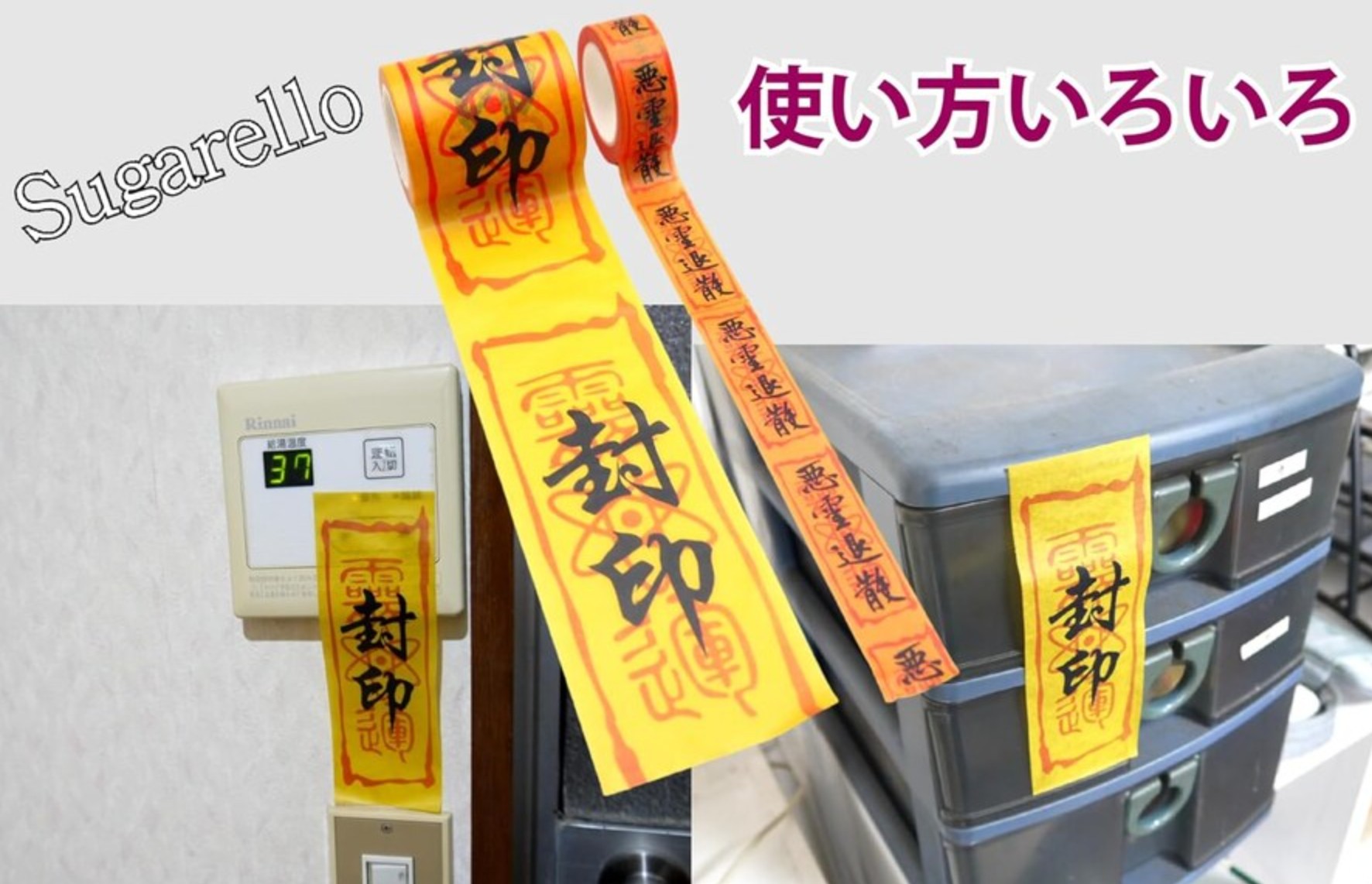そのテープには「封印」や「悪霊退散」といった文字が大きく印刷されており、まるで昔のお札や古い道具のような見た目です。