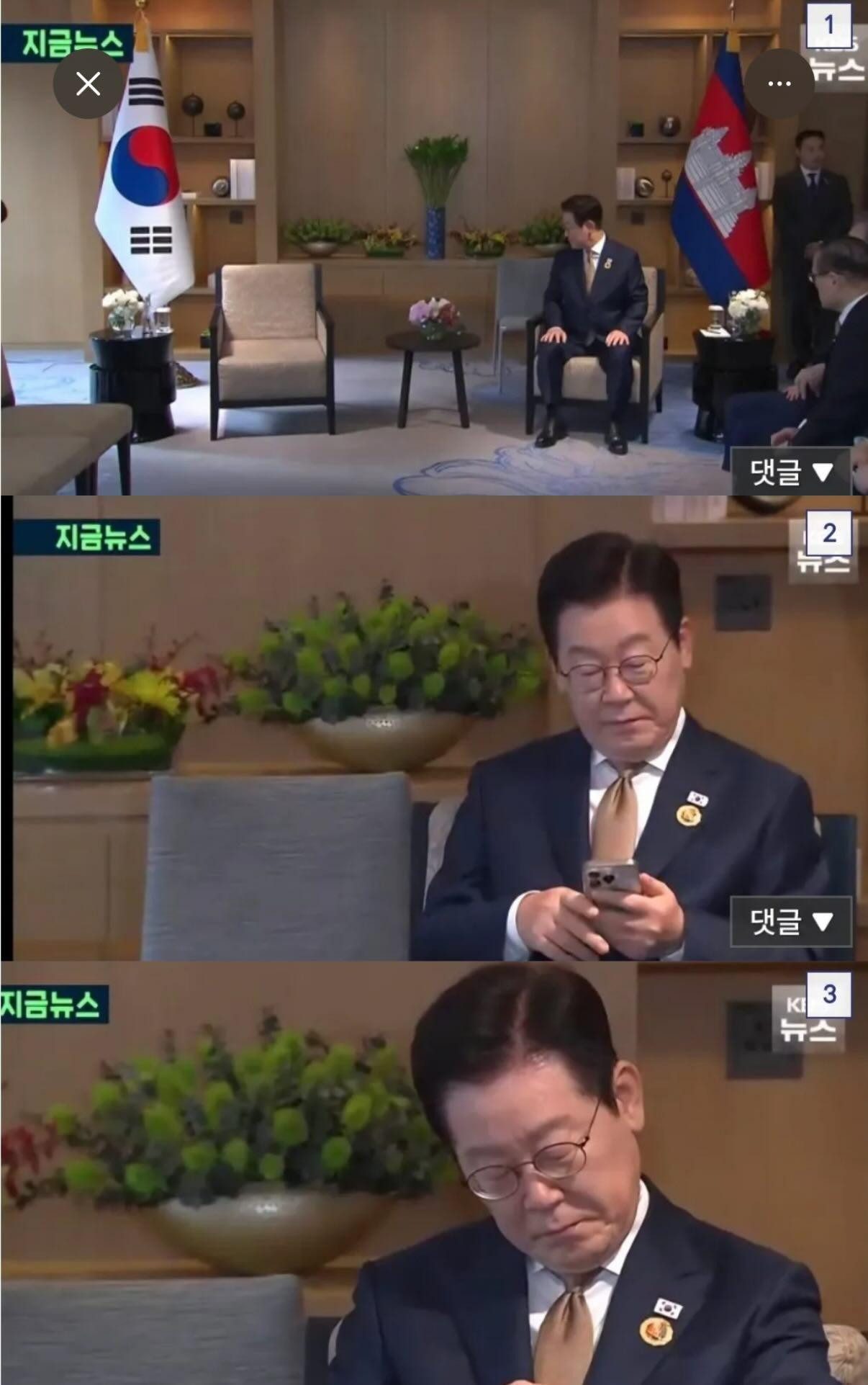 아세안 정상회담에서 캄보디아 대통령 기다리는 이재명.