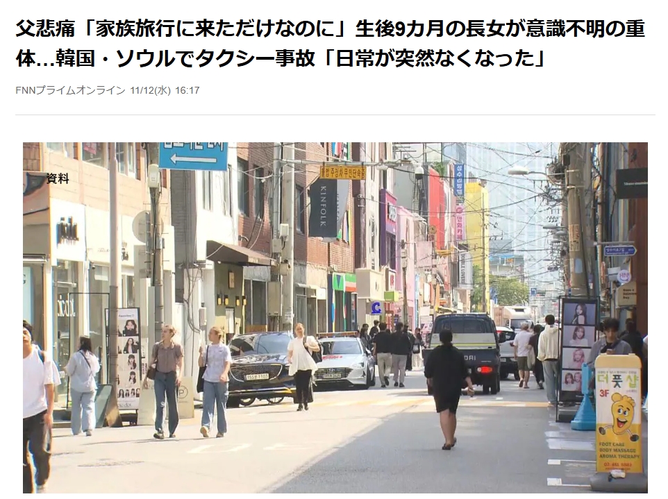 한국·서울시내에서 10월 21일에 발생한 택시 사고로, 일본으로부터 관광으로 방문하고 있던 20대 부부와 생후 9개월의 장녀가 승차하고 있던 택시가 맞은편 차선에는 봐 내, 주행중의 차와 정면충돌했다.부부는 골절의 중상, 장녀는 의식 불명의 중태가 되고 있다.운전하고 있던 70대 남성은 경찰에 「액셀을 잘못하고 밟았다」라고 설명하고 있지만,부친은 「운전기사는 콧노래를 노래해, 급가속 해도 당황하는 님 아이가 없었다」라고 증언했다.