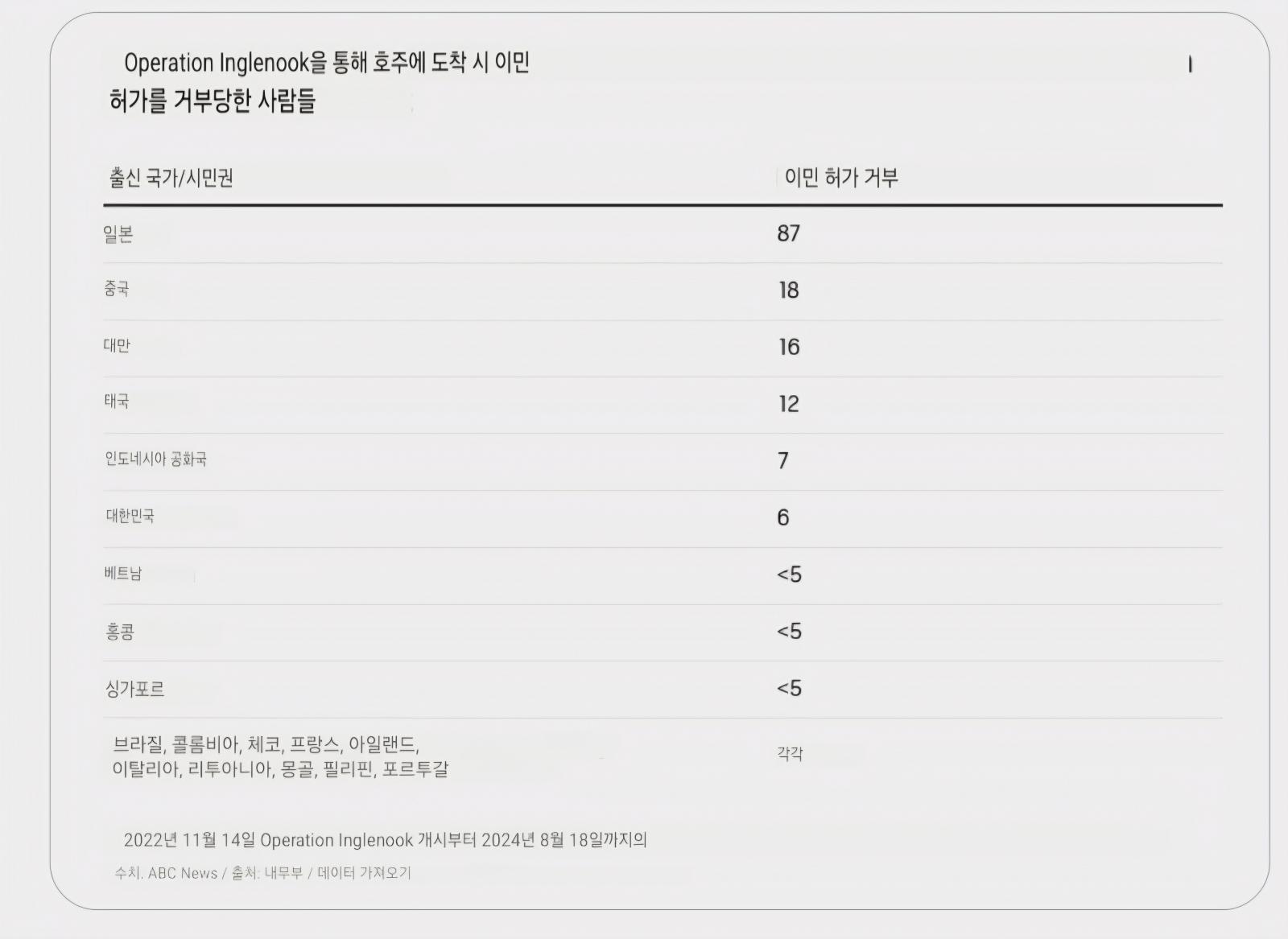 오스트레일리아 에 도착한 후 이민 허가를 거부 당한 나라 순위