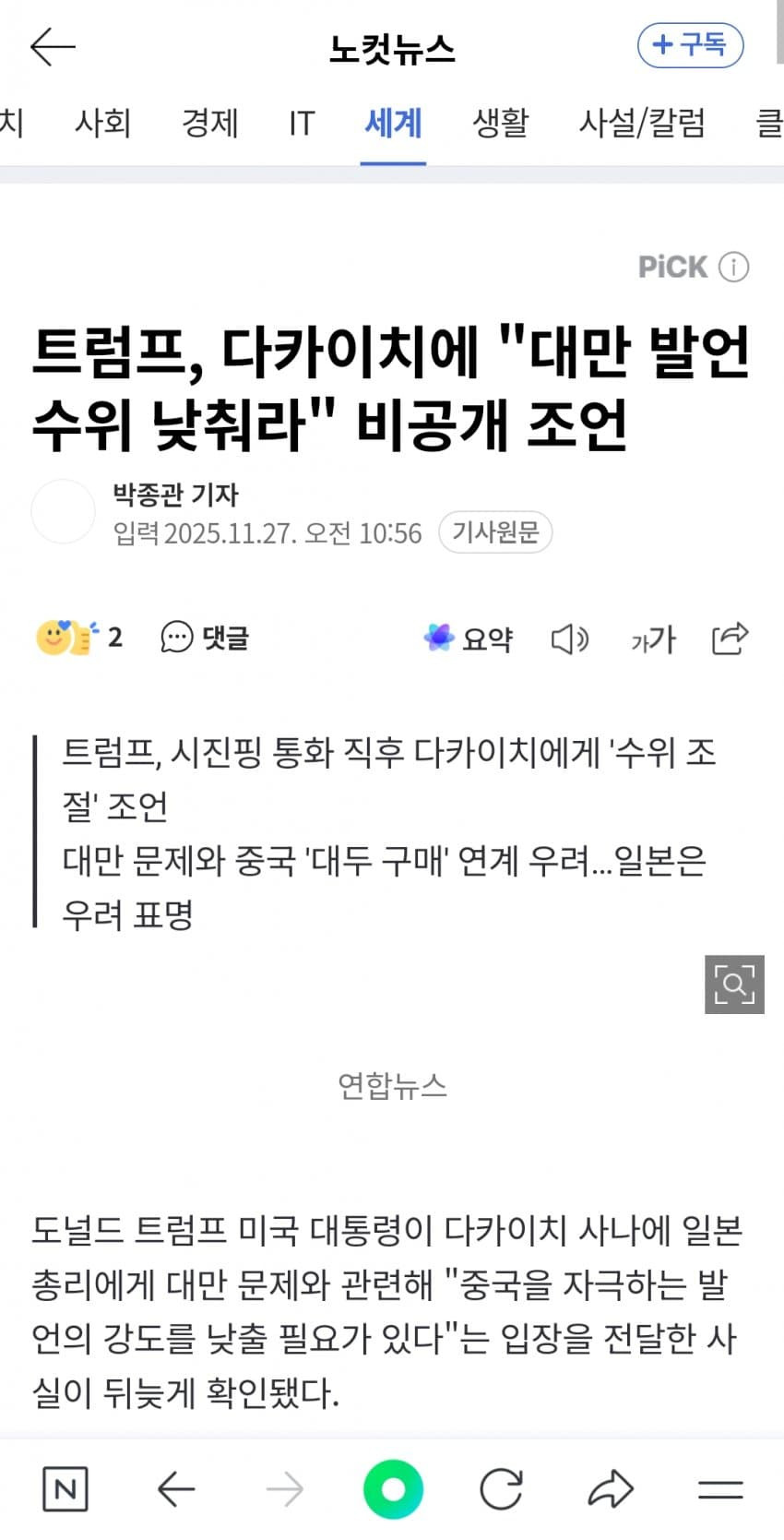트럼프는 高市와 통화에서 "중국을 자극하는 발언의 强度를 낮출 필요가 있다."는 입장을 전달한 사실이 뒤늦게 확인했다.
