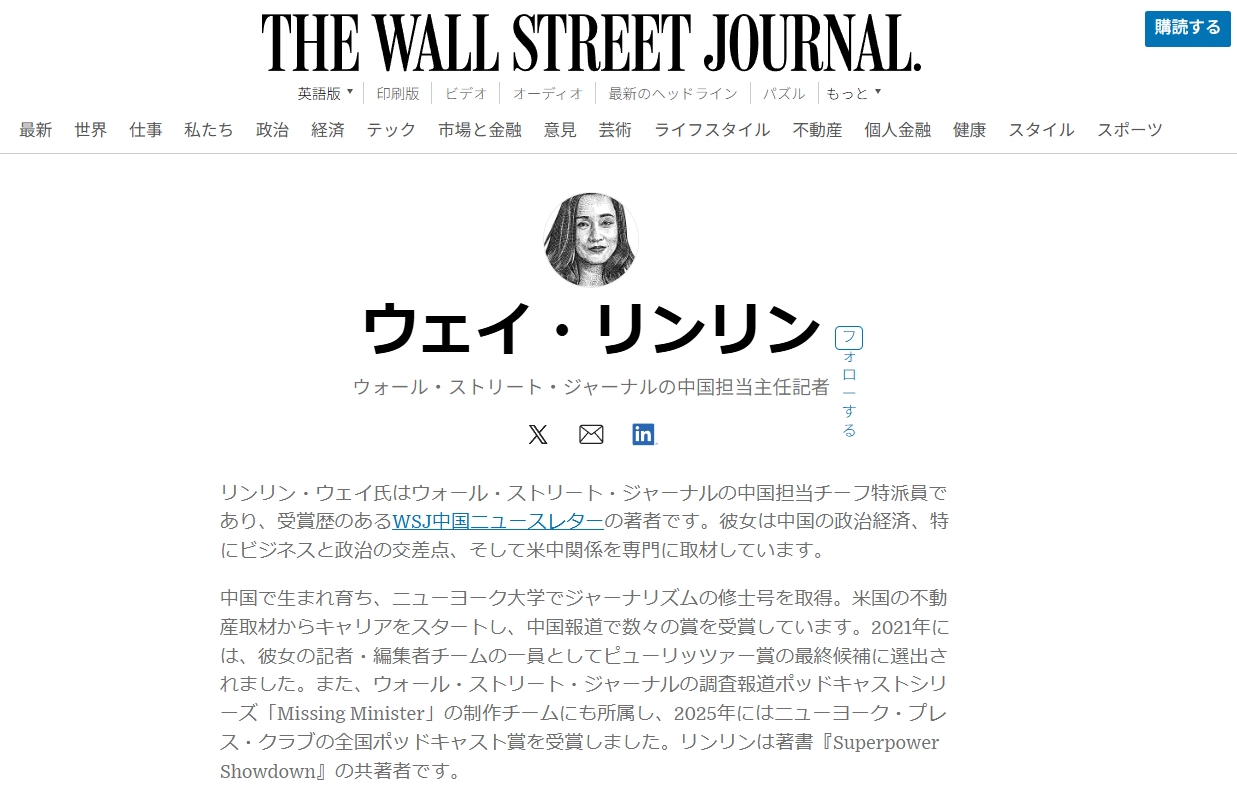リンリン・ウェイはウォール・ストリート・ジャーナルの中国担当チーフ特派員であり、受賞歴のあるWSJ中国ニュースレターの著者です。中国の政治経済、特にビジネスと政治の交差点、そして米中関係を専門に取材しています。
