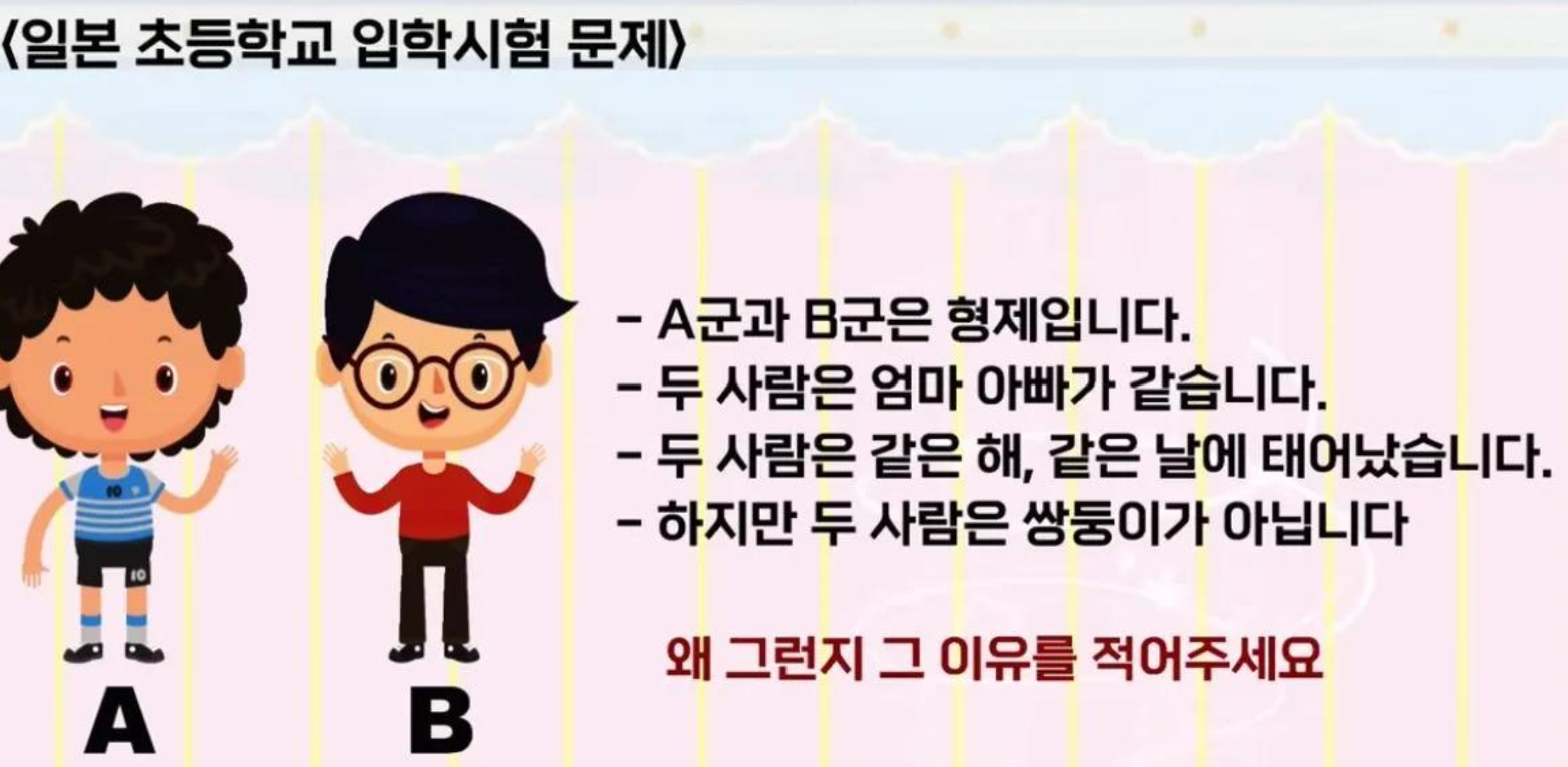 그 때문에, 「두 명은 같은 날로 태어난 형제=쌍둥이」라고 하는 것은 아니다는, 언어적인 발상을 묻는 문제였습니다.