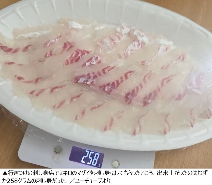Aさんは「マダイは1キロ当たり2万7000ウォンだったので5万4000ウォン(約5600円)、コノシロは1キロ当たり2万3000ウォンだったので4万6000ウォン(約4800円)、合計10万ウォンを支払った」「ところが、(刺し身にしてもらったものを)家に持ち帰って確認したところ、マダイの量が少なすぎた」とつづった。その後、パックに入ったマダイの刺し身をはかりに載せたところ、容器を含めて258グラムしかなかったという。このためAさんは刺し身店に可食部の割合を訪ねたところ、マダイは40%、コノシロは50%とのことだった。
