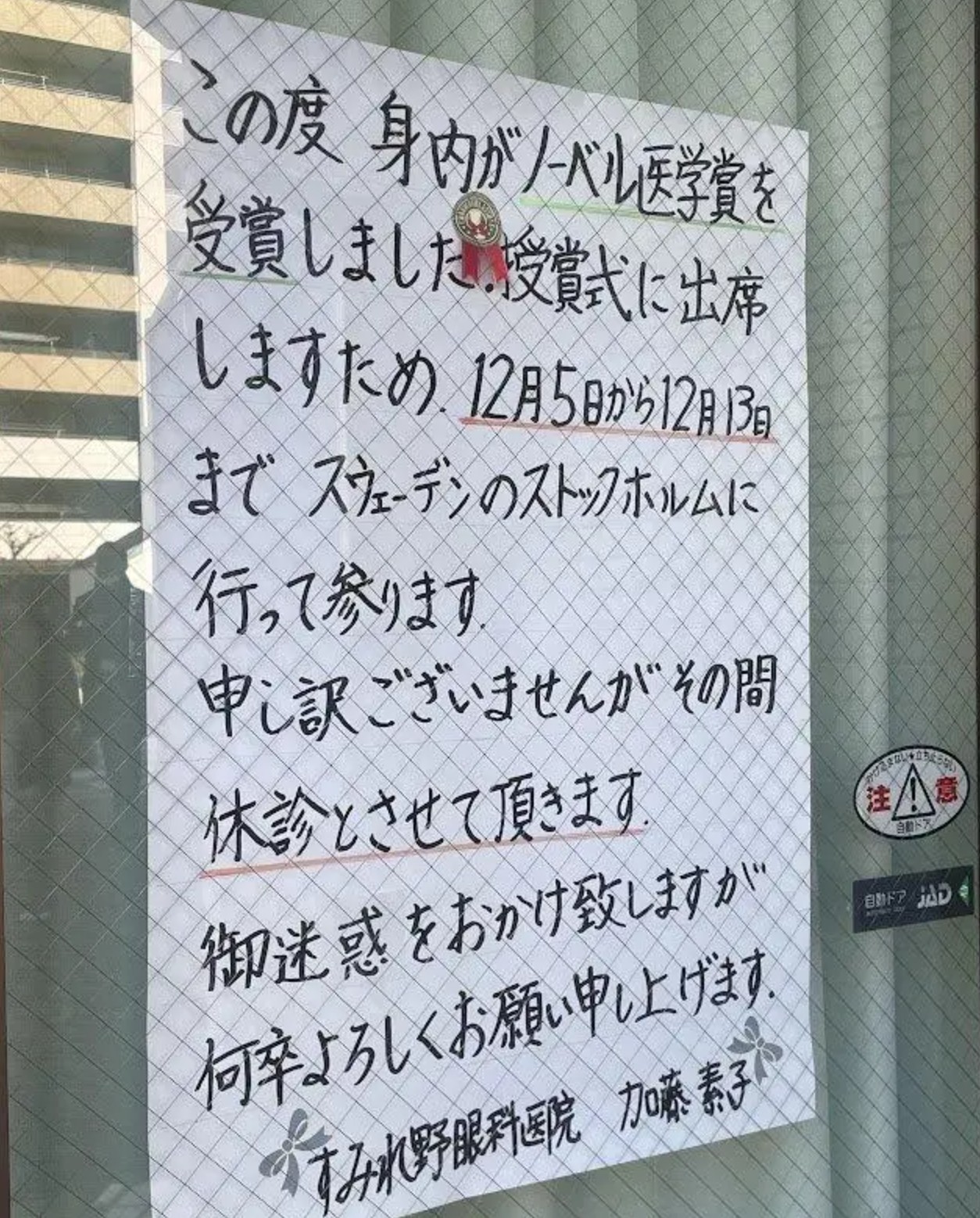 「この度 身内がノーベル医学賞を受賞しました。受賞式に出席しますため、12月5日から12月13日までスウェーデンのストックホルムに行って参ります。申し訳ございませんがその間休診とさせていただきます。」