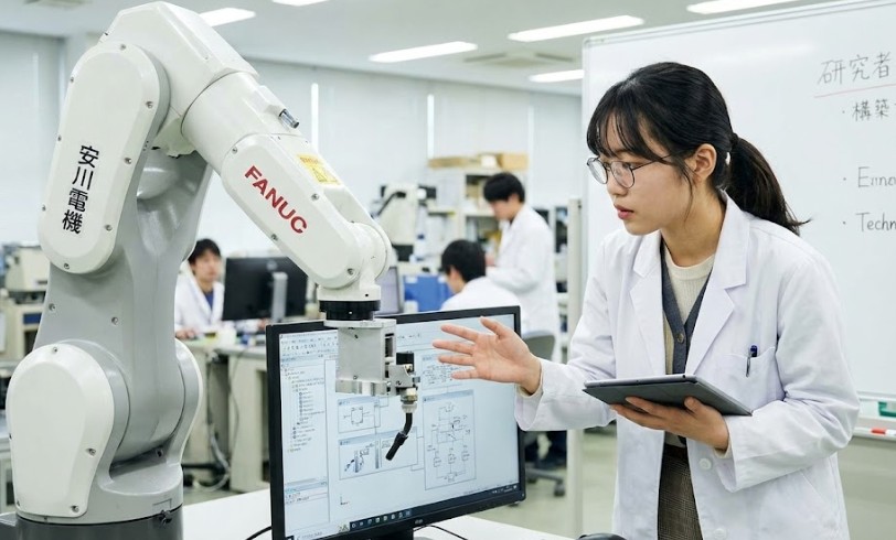 日本製工業用ロボットを研究する女性エンジニア