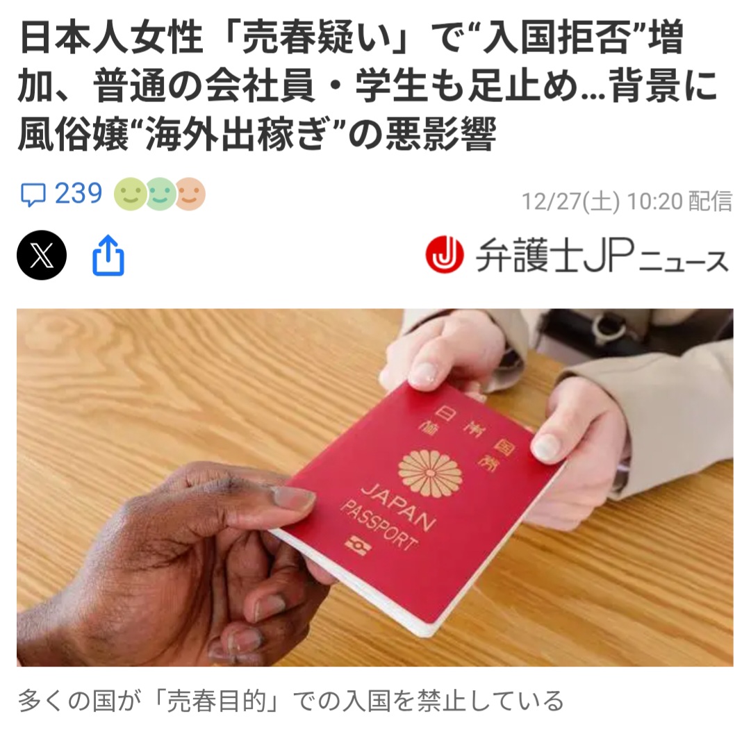 미국이나 호주 등에 입국했을 때 관광 예정이었던 여성이 "매춘과 불법 취업의 혐의"를 이유로 발판이 멈추는 경우가 늘고 있다. 입국 거부나 강제송환에 이르기도 하고, 행정서사나 변호사에게의 상담도 증가하고 있다고 한다.