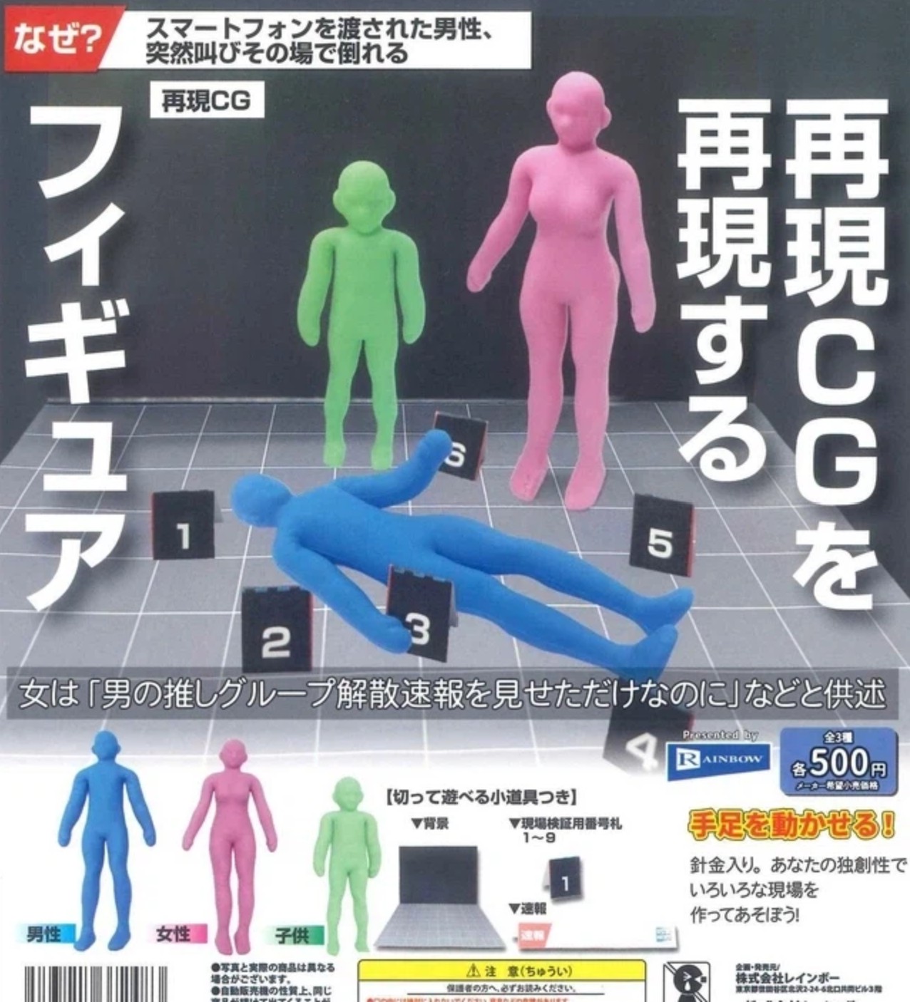 화제가 되고 있는 것은, 일본의 보도 프로그램이나 뉴스 해설로 잘 사용되는 「사건·사고의 재현 CG」를 모티프로 한 피겨입니다.그 독특한 질감을 가지는 「푸른 남성」 「핑크 여성」 「초록의 아이」의 모델이, 현장검증용의 번호표나 속보 텔롭의 소도구와 함께 세트가 되어 있습니다.